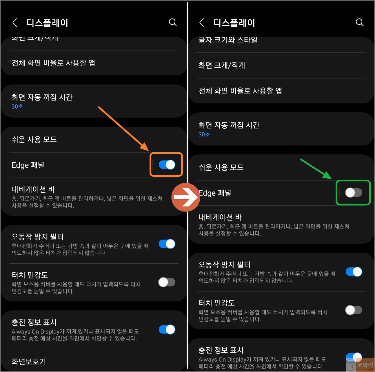 ▲디스플레이 설정한 중간쯤에 있든 edge 패널의 활성화 바를 터치하여 비활성화 상태로 변경해 줍니다.